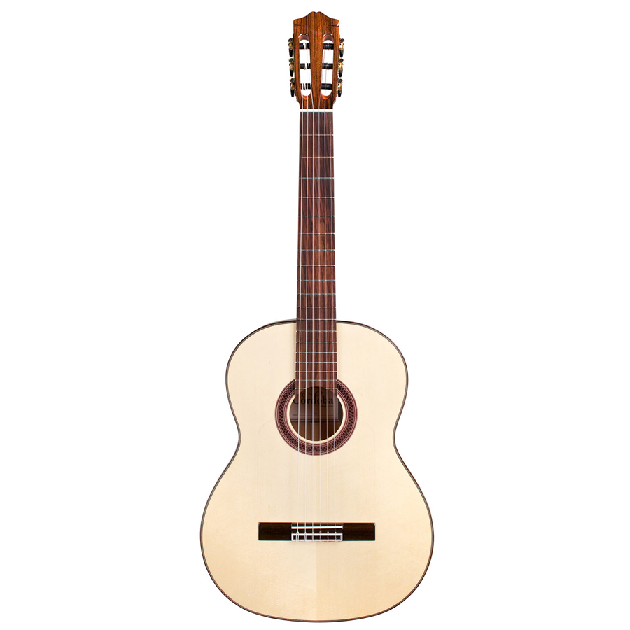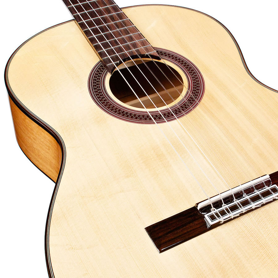 The F7 is our entry-level flamenco model featuring the traditional combination of a solid European spruce top paired with cypress back and sides. It's a perfect fit for both beginner and intermediate flamenco players. Incredibly lightweight, the F7 is built in the Spanish tradition with a slightly thinner body depth than a classical guitar. Additionally, its flat neck angle gives this guitar low action, and the bright, snappy tone characteristic of flamenco guitars. A clear flamenco-style tap plate comes installed on the top for an added layer of protection and like all Córdoba guitars, the F7 includes a two-way truss rod inside the neck for action adjustment and long term stability.